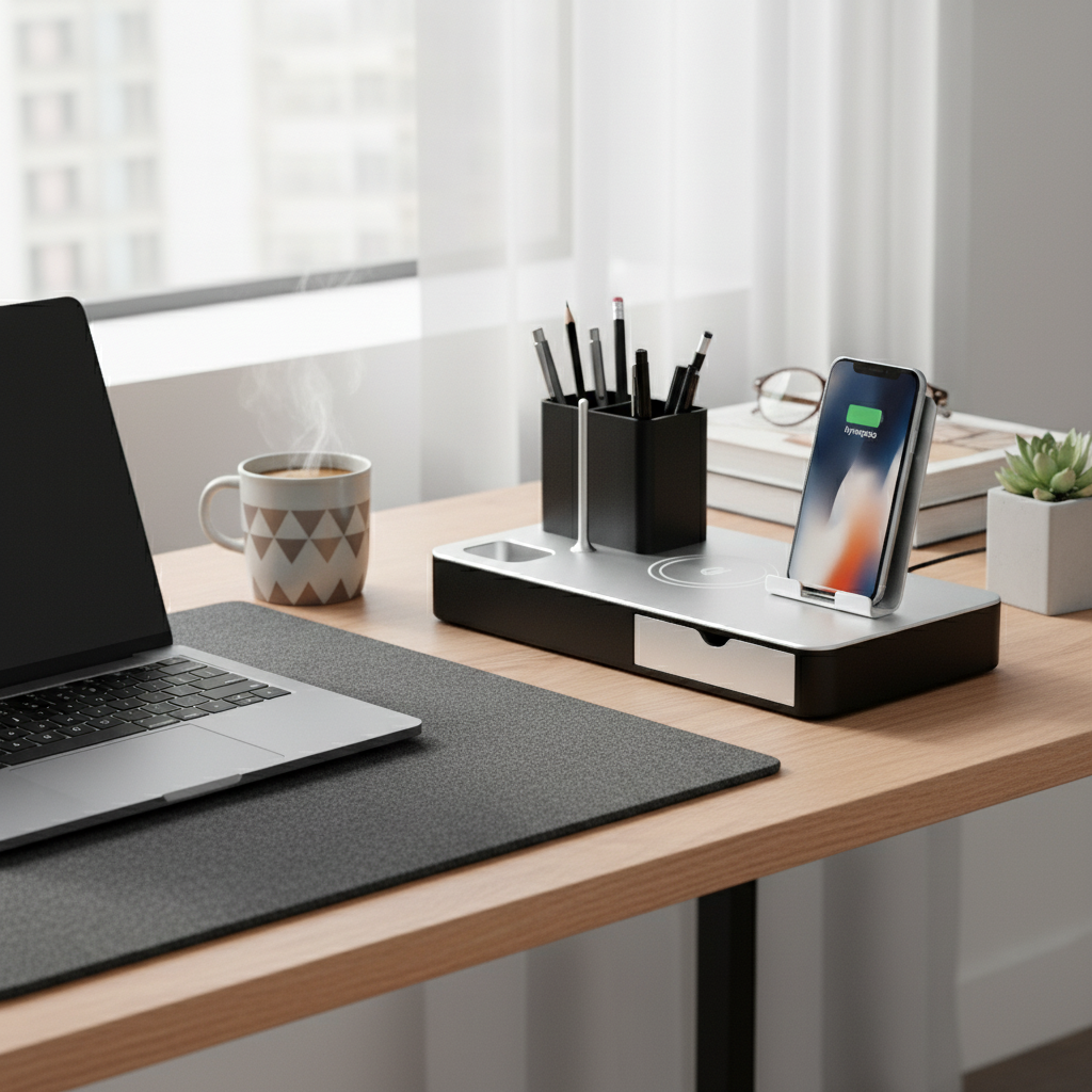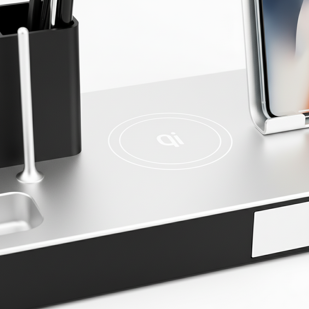 Reclaim your focus and streamline your workspace with the Zynqoro Smart Desk Organizer. This all-in-one solution combines elegant organization with the convenience of fast wireless charging, creating a modern, efficient, and clutter-free environment.
